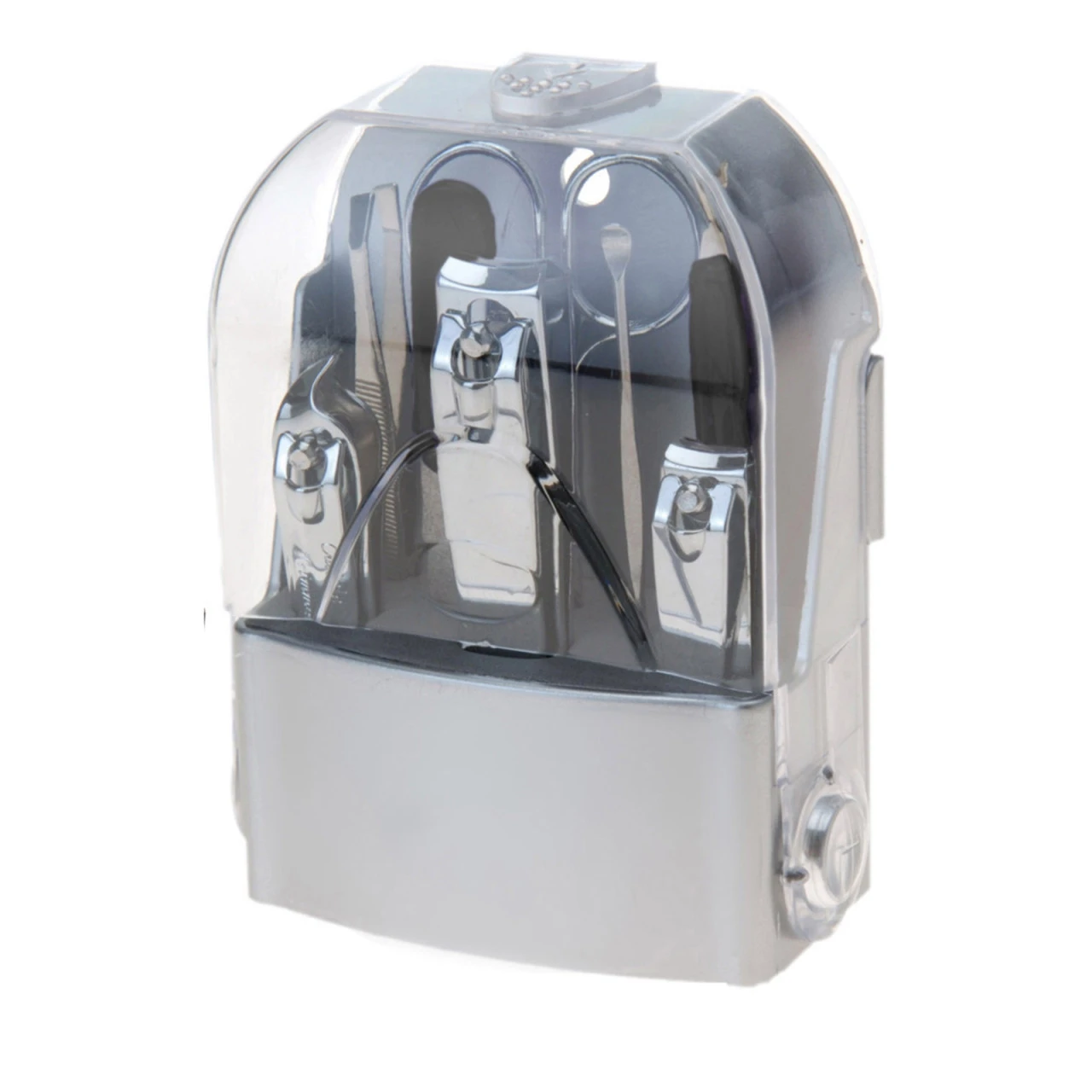 Dieses praktische Maniküreset beteht aus Pinzette, Nagelfeile, Schere, 2 Nagelhautschieber, 3 verschiedenen Zangen.