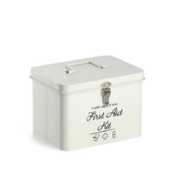 Aufbewahrungsbox aus Metall im Retro-Stil für Ihre Hausapotheke. Das Erste Hilfe Kit und Medikamente sind darin gut und sicher vor Kindern aufgehoben. Maße 22,4 x 17 x 16 cm