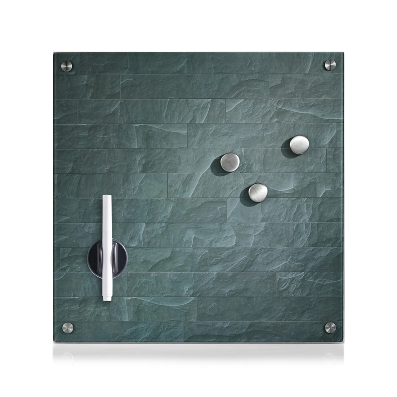 Dieses aussergewöhnliche Memobord verbindet Funktionalität und modernes Design- die perfekte Ergänzung für moderne Einrichtungskonzepte. Ob in Ihrem Büro, in der Küche oder im Flur, das dekorative Memobord ist ein echter Hingucker. Dank der beschreibbaren Glasoberfläche und dem mitgelieferten Stift können Sie Ihre wichtigen Termine schnell notieren. Mit einem Wisch ist Ihr Geschriebenes auch wieder weg. Postkarten, Notizzettel oder Fotos geraten nie mehr in Vergessenheit, denn diese können einfach mit den Magneten befestigt werden. Für eine einfache und schnelle Selbstmontage wird das benötigte Material mitgeliefert. Hinweis: Bedingt durch die Eigenschaften von Glas nutzen Sie am besten extra starke Magnete.
