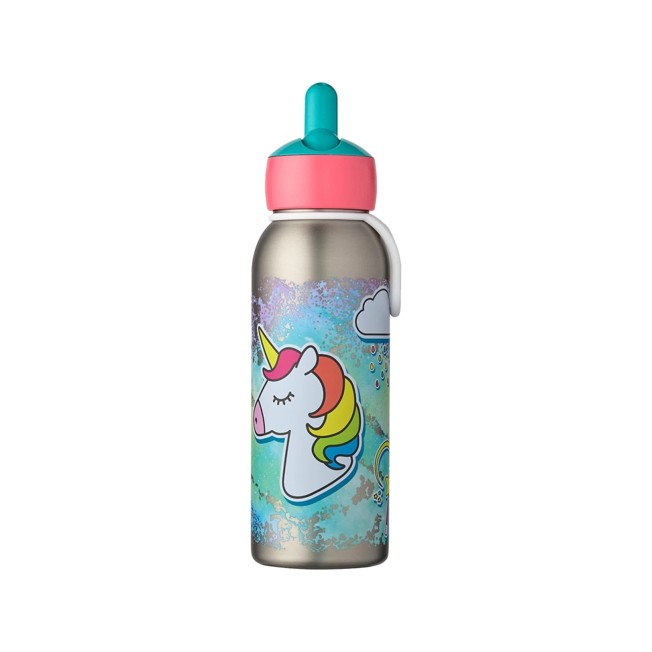 Trinkflasche aus doppelwandigem Edelstahl. Hält Getränke 9 Stunden heiß oder 12 Stunden kalt. Auch für kohlensäurehaltige Getränke geeignet. Mit praktischem Flip-up-Trinksystem – einfach den Ausgießer nach oben drücken und trinken! Die Trinkflasche ist auslaufsicher. Handwäsche wird empfohlen, der Deckel ist spülmaschinenfest. Maße Ø 6,5 cm (mit Schlaufe 7 cm), Höhe 20,2 cm, Nutzinhalt 350 ml