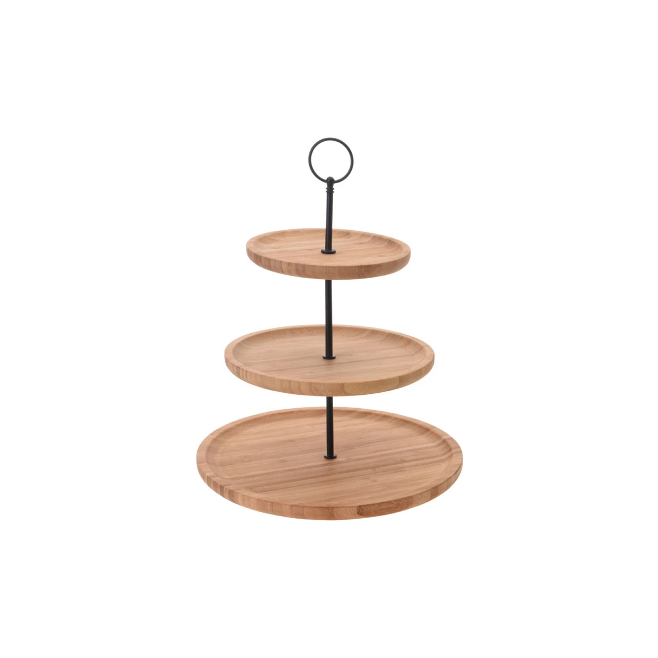 Die Servierplatte mit 3 Etagen kann für Kuchen, Törtchen, Canapes, Petit Four, Obst, Dips etc. verwendet werden. Material: Bambusholz, Stahl. Maße: Höhe 35 cm Ø der drei Teller: 16,5 cm, 21 cm, 28 cm