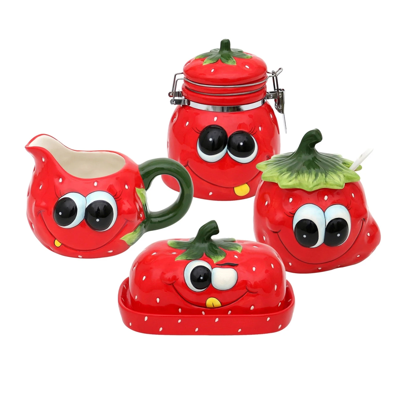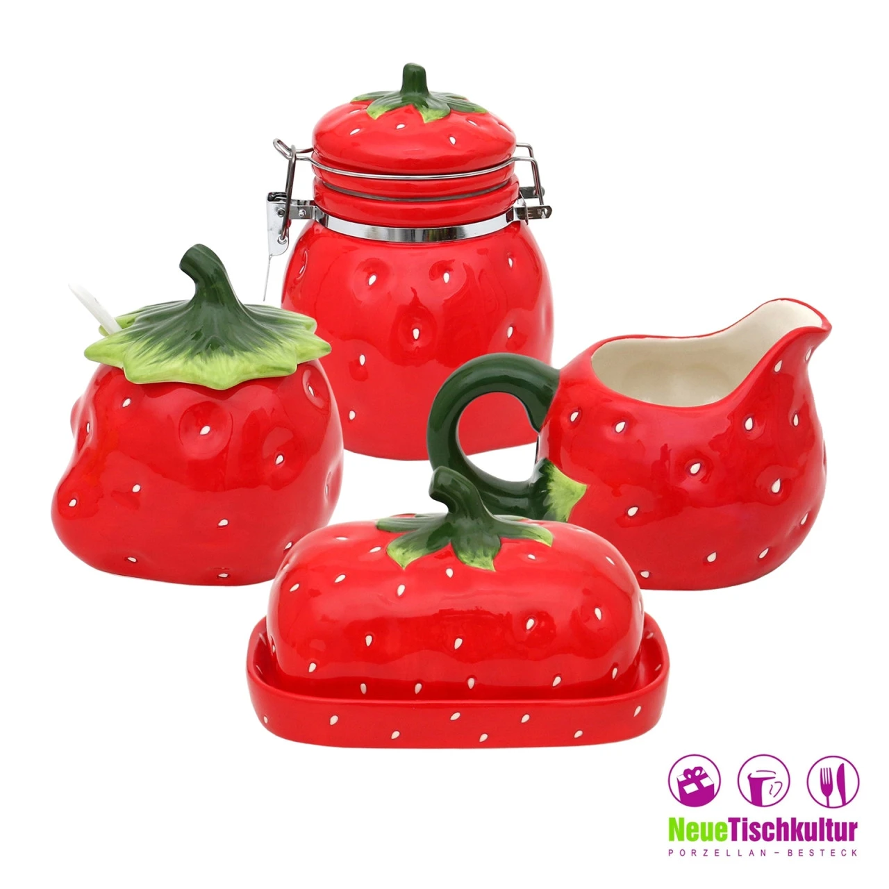 | Lieferumfang: | 1x Butterdose, 1x Milchkännchen, 1x Vorratsglas, 1x Zuckerdose mit Löffel |