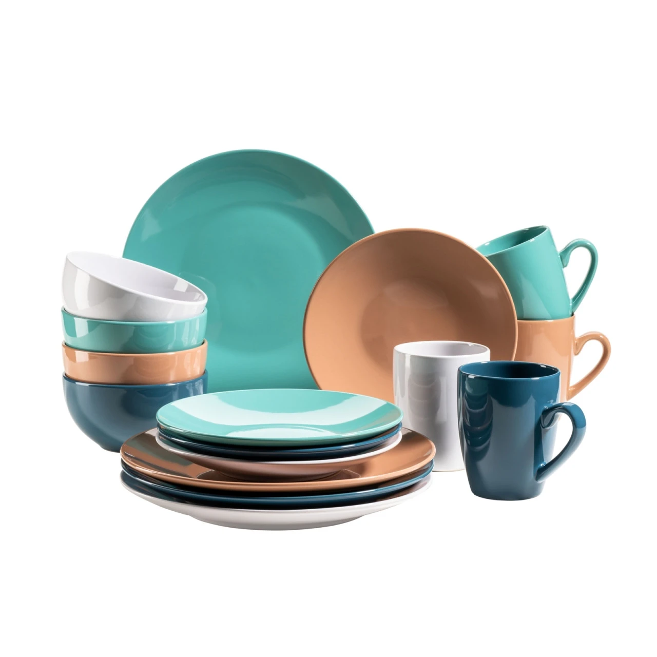 Das 16-teilige Kombiservice aus hochwertigem Steinzeug besticht durch sein farbenfrohes, dennoch harmonisch abgestimmtes Design. Jedes Teil wird in den Trendfarben Perlmutt, Haselnuss, Ozeanblau und Smaragdgrün geliefert. Die Serie ist mikrowellengeeignet sowie spülmaschinenfest und daher nicht nur für festliche Anlässe, sondern auch für den täglichen Gebrauch geeignet.