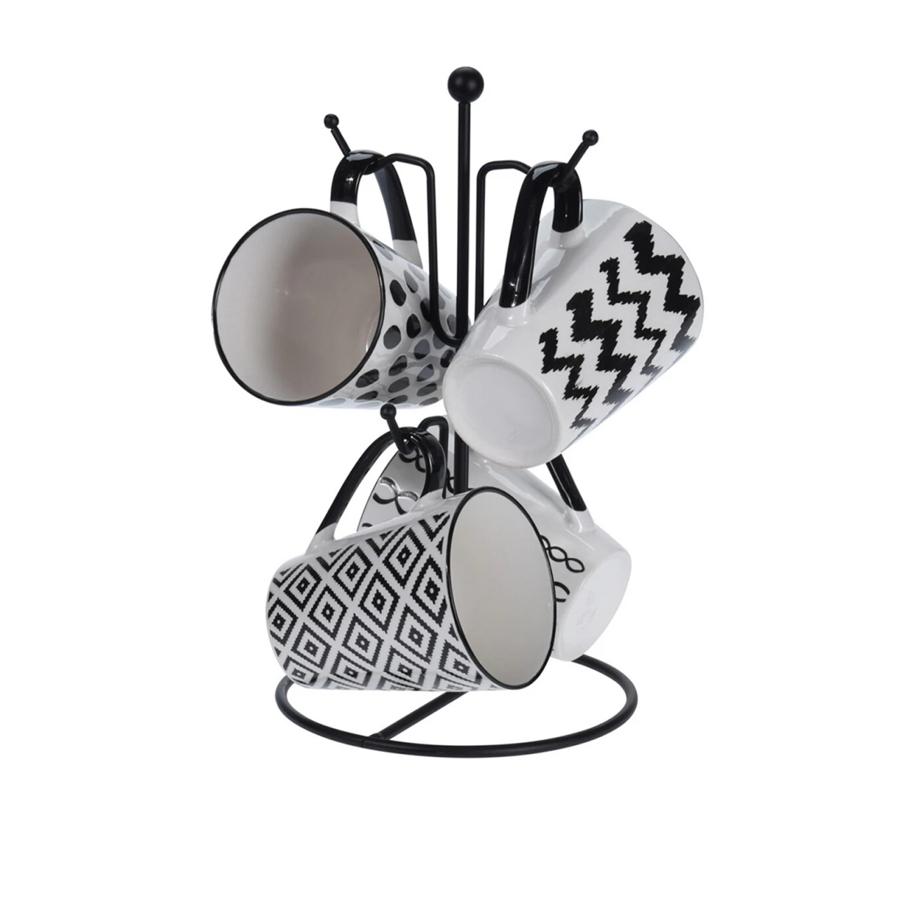Das Set besteht aus 5 Teilen: 4 moderne Tassen- jede anders designt- und einen Tassenhalter aus Metall. Das Keramik-Tassenset enthält große 310 ml Tee- oder Kaffeetassen auf einem stabilen und stabilen Metallständer. Jede weiße Tasse ist mit einem anderen geometrischen Muster in Schwarz verziert. Dank ihres raffinierten Stils und ihrer universellen Farben werden Steinzeugbecher sicherlich jeden verzaubern, der modernistisches oder skandinavisches Design mag. Maße: Ø 9 cm H 10 cm