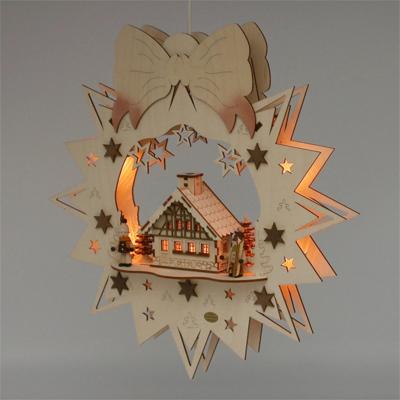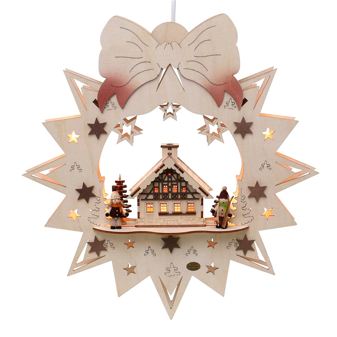 Der Holz Fensterbild „Wintersport“ sorgt für gemütliche Weihnachtsstimmung an Ihrem Haus. Von Innen wie von Außen wird dieses Fensterbild, in deren Mitte eine Skihütte mit Wintersportlern abbildet ist, zum leuchtenden Blickfang. Außen eine wunderschöne Sternenform mit einer großen Schleife. Das Fensterbild wird mit 230 Volt-Stecker betrieben. Ein traumhafter Weihnachtsschmuck, der Ihrem Wohnambiente einen gemütlichen Touch verleiht! Maße: 36 x 7 x 38 cm, 230 V Kabel, 5 flammig, Spitzkerzen