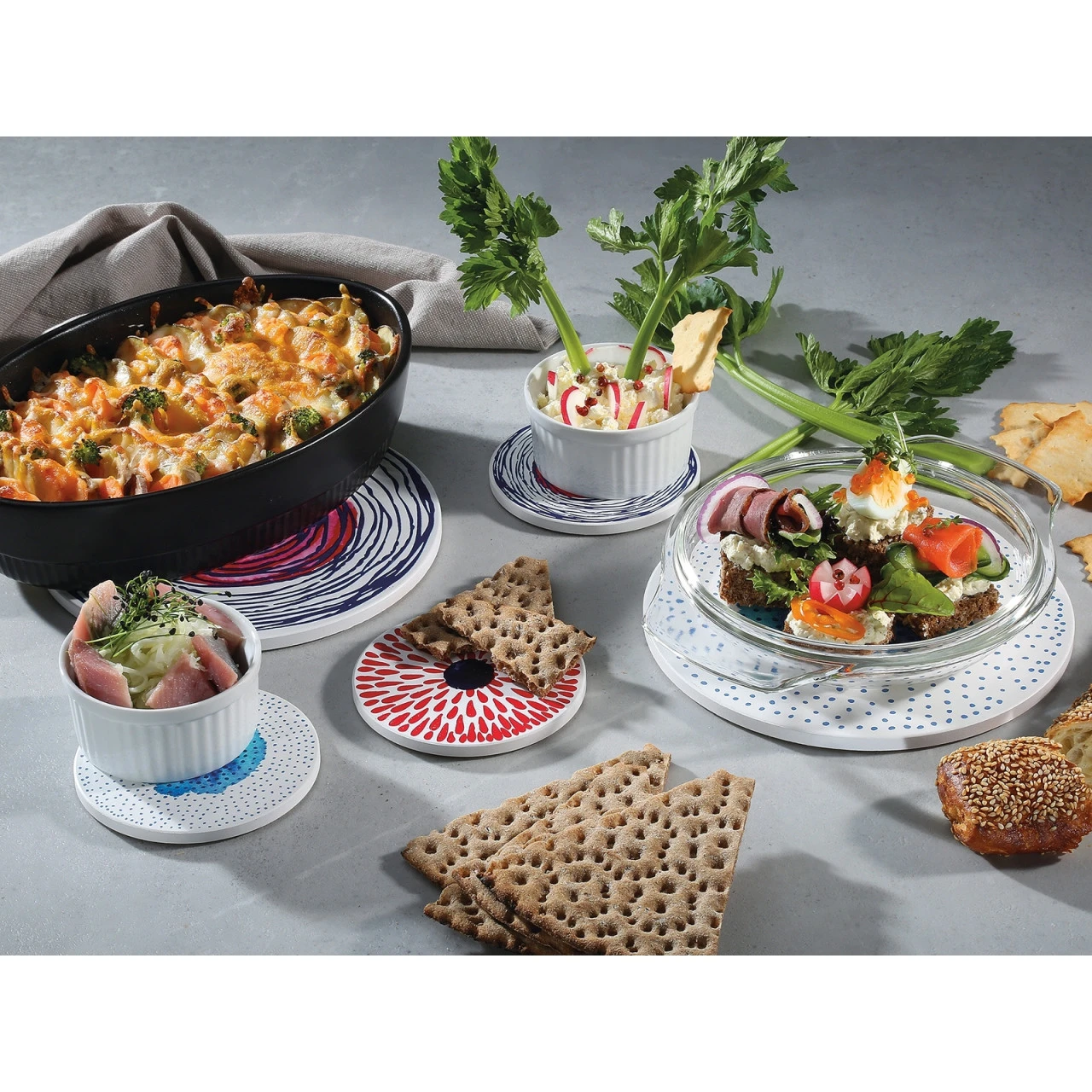 Die Topfuntersetzer mit Korkboden bestechen durch ihr skandinavisches Design. Der Untersetzer ist ein sehr komfortables und unverzichtbares Accessoire in der Küche, das empfindliche Oberflächen vor den hohen Temperaturen heißer Töpfe und Pfannen schützt. Die Kork-Rückseite verhindert Kratzer auf der Tischoberfläche und sieht edel aus. Hitzebeständig bis 180°C. Durchmesser: 11 cm. Die Untersetzer dieser Serie gibt es noch in der Größe 20 cm.